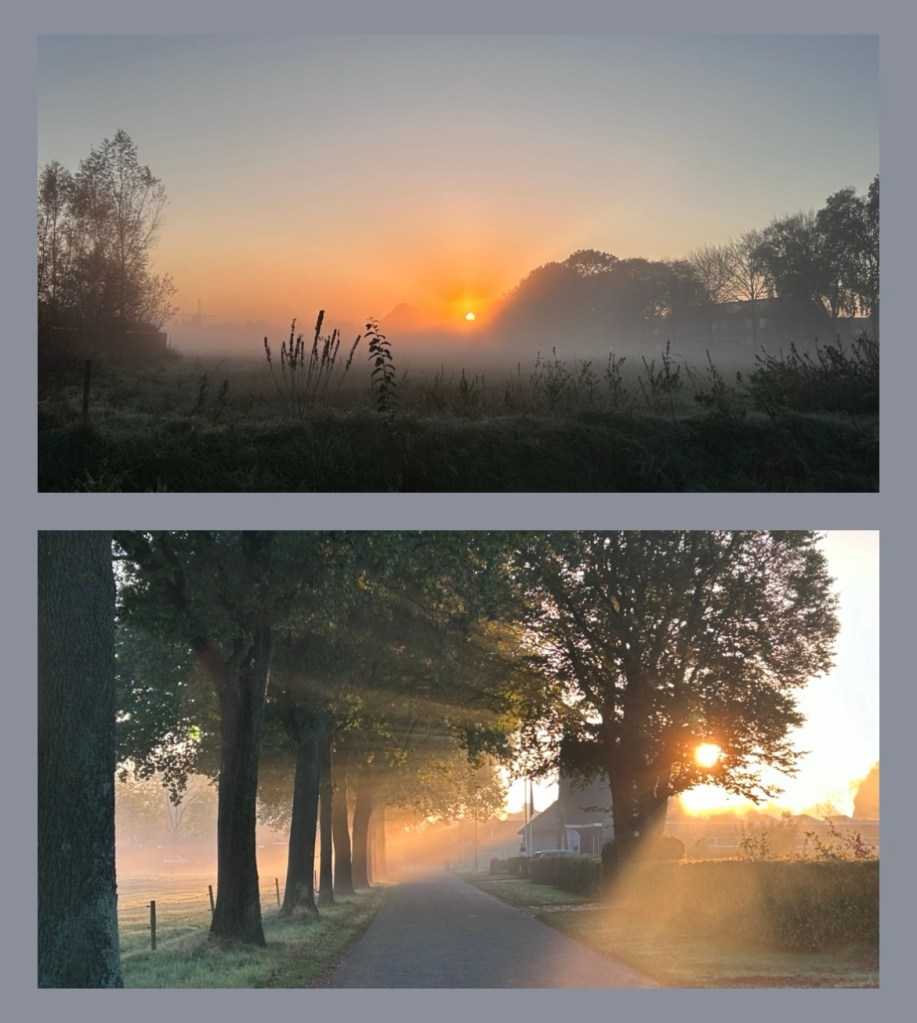 Door het grijze en de mist heen zie ik vaag in de verte de schaduwen van de bomen,met hun nog volle kleurrijke bladeren dak of hun kaler wordende vliegende taken.