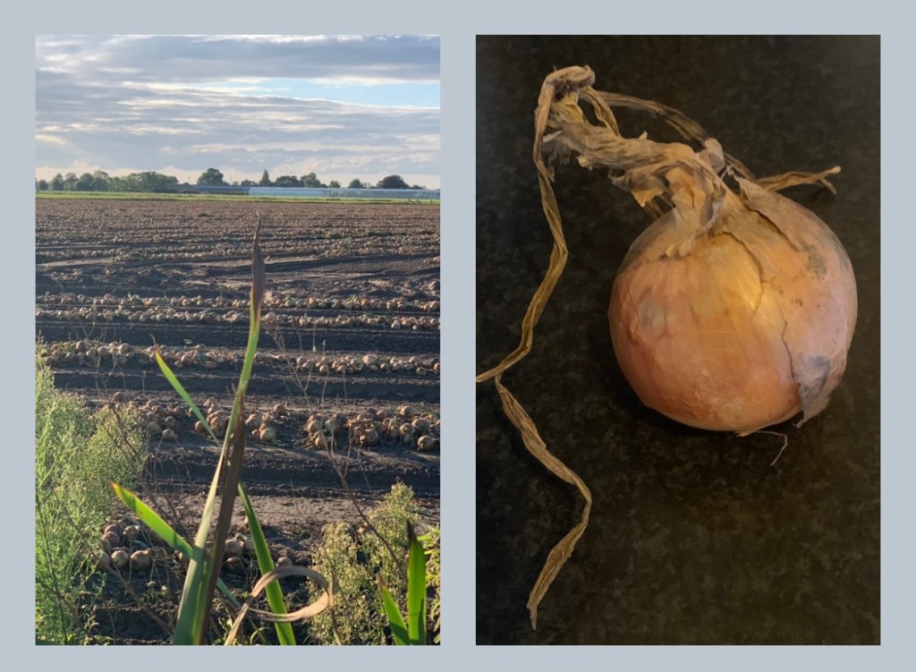 Afgelopen week op mijn dagelijkse fietsronde reed ik langs een aantal velden waar rijen uien in verschillende groten en kleuren klaar lagen om opgehaald te worden.